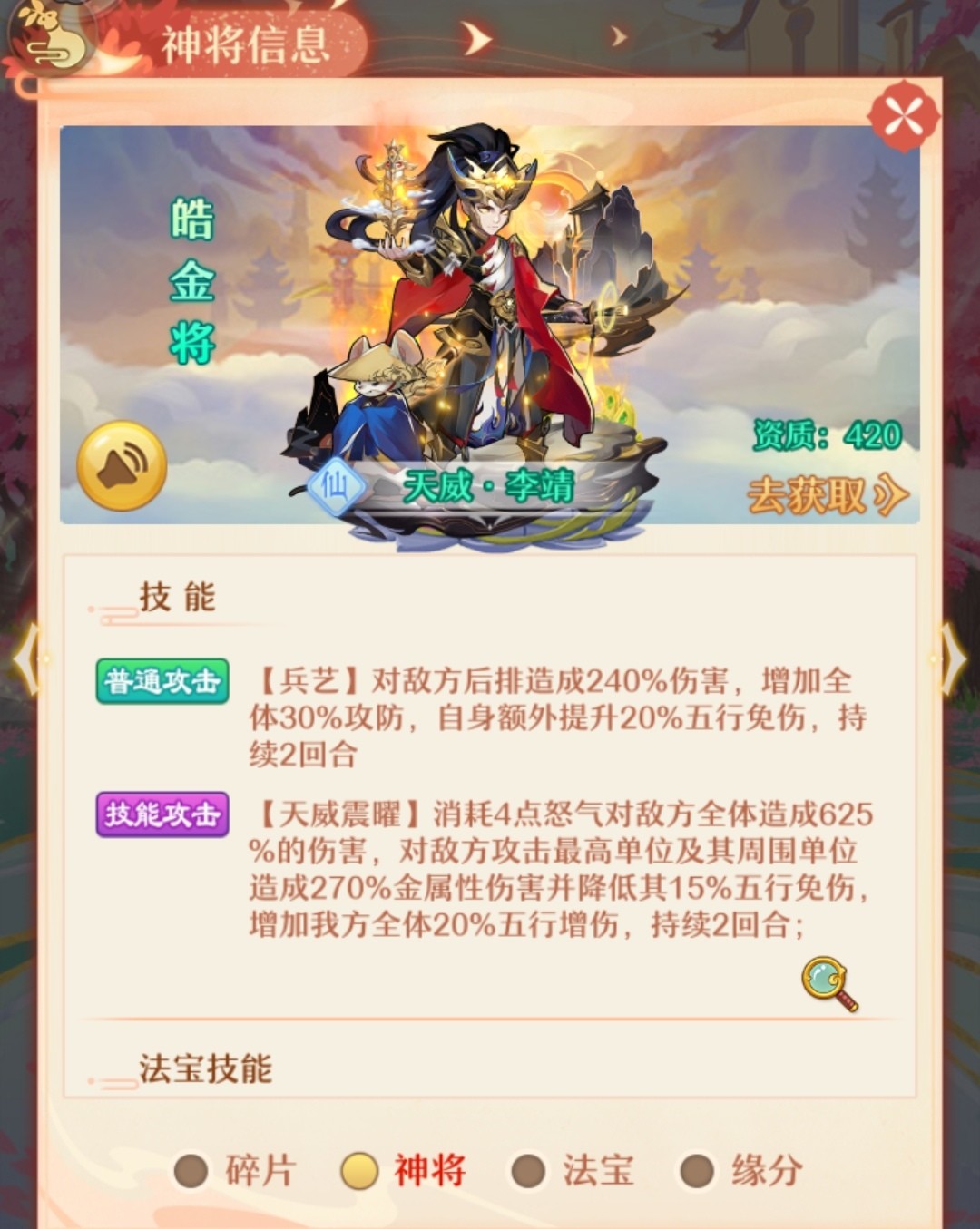降低对方土属性免伤和五行免伤,每次受到攻击时李靖可额外对其追加500%土属性伤害。