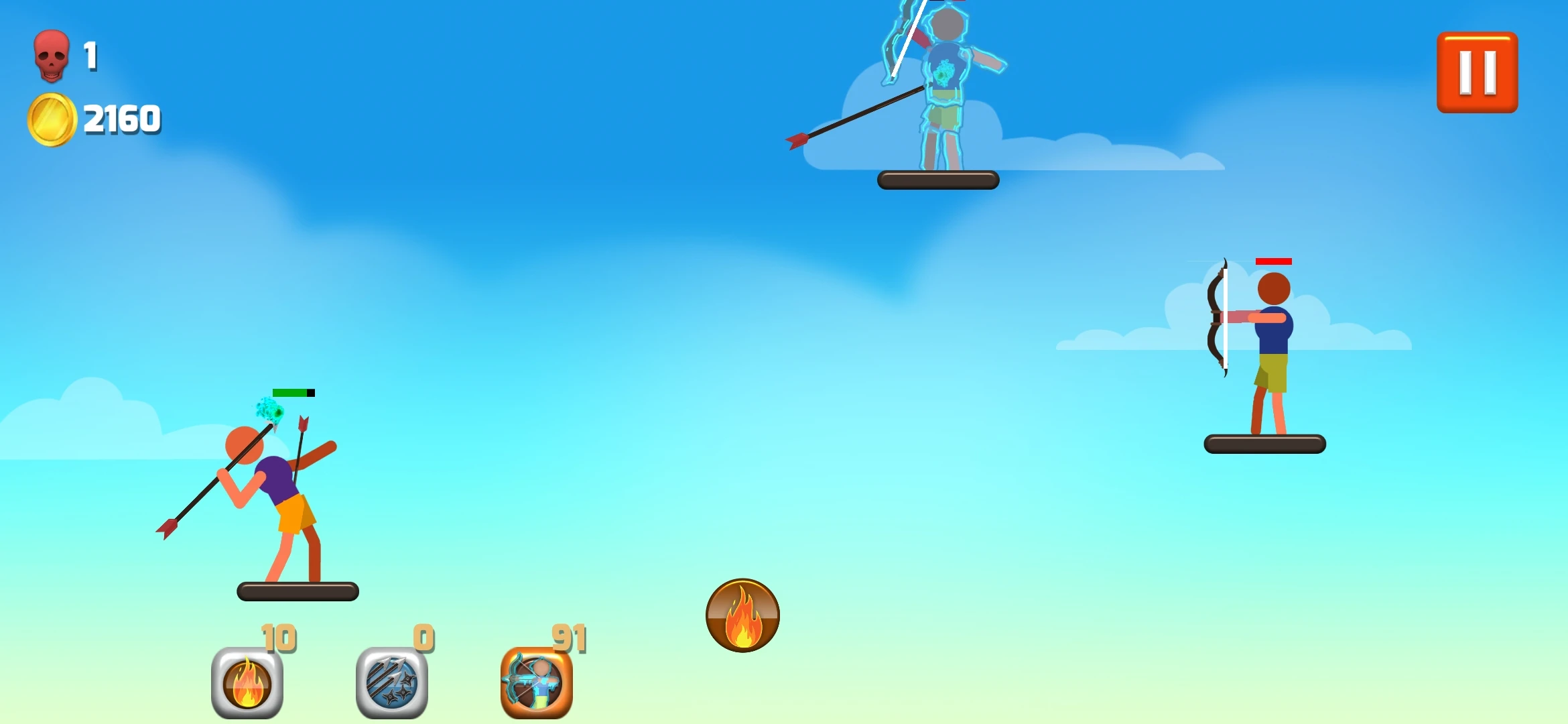 正所谓双拳难敌四手,看见屏幕一大波敌人齐齐射击,高手也顶不住呀!这时就要介绍本作的技能系统了,分别有火焰、冻结和三连射技能。火焰能够给予敌人持续的灼伤,冻结则能永久限制敌人的攻击,让玩家免于被围攻的危险。三连射则是本作的最强技能,同时射出三发弓箭或手里剑,给予敌人三倍伤害打击,瞬间清屏非常爽~