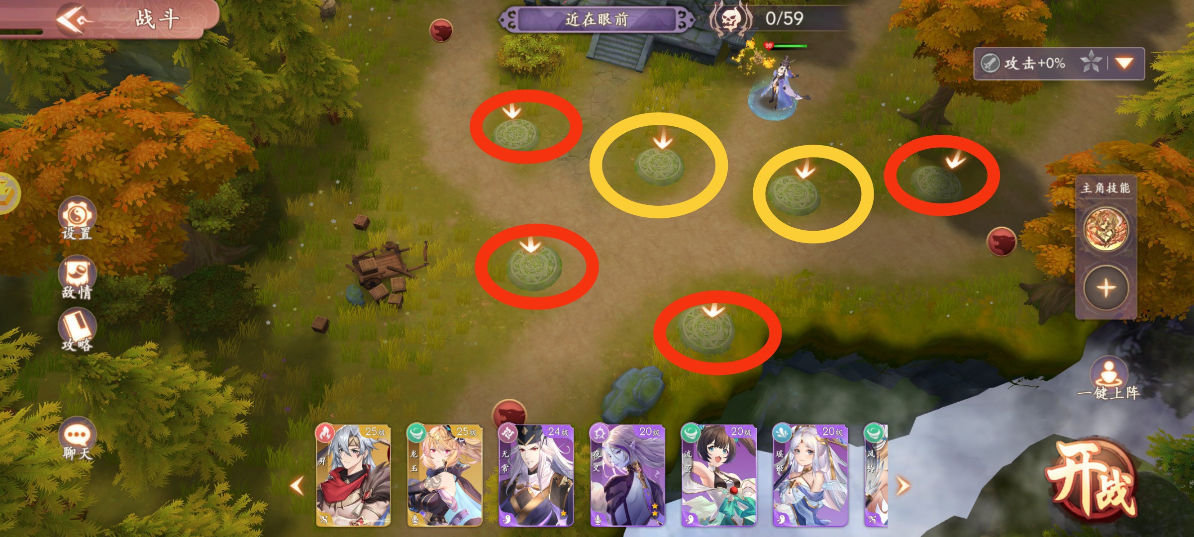 ①前置位(红色圈),顾名思义,在每个路线能第一个接触到怪物的位置,通常只能顾及1-2个路线,部分地形好的情况下前置位更适合输出。