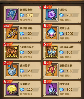 优先购买:免费道具,其次4折以内道具,比如进阶石,5星随机碎片,遥控塞子,符文精华