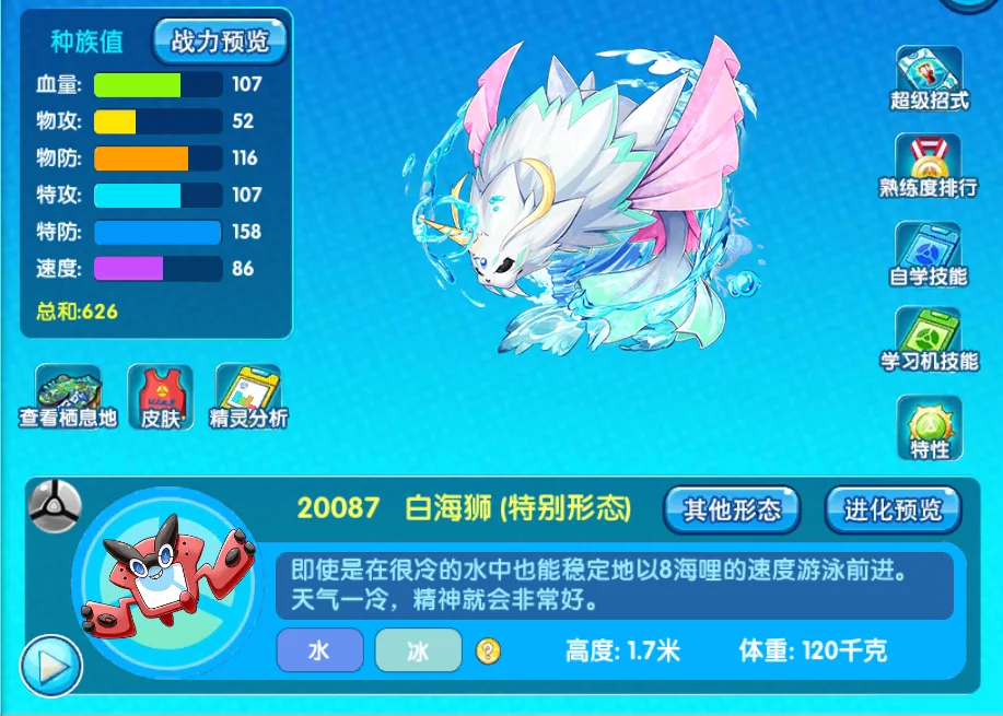 总结分析:白海狮是一个相对而言比较好的辅助,基本上就是用来联防冰属性技能,还有就是用来开天气都是十分不错的选择,看玩家自身应该怎么选择了?