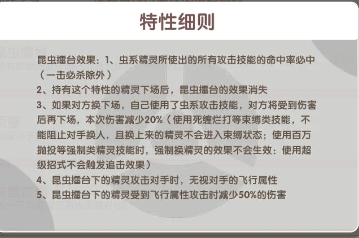 但是人家也有自身的优势,人家有一个专属特性,昆虫擂台,这个特性的效果,我会用图片的方式给大家介绍,因为实在是字太多了😭