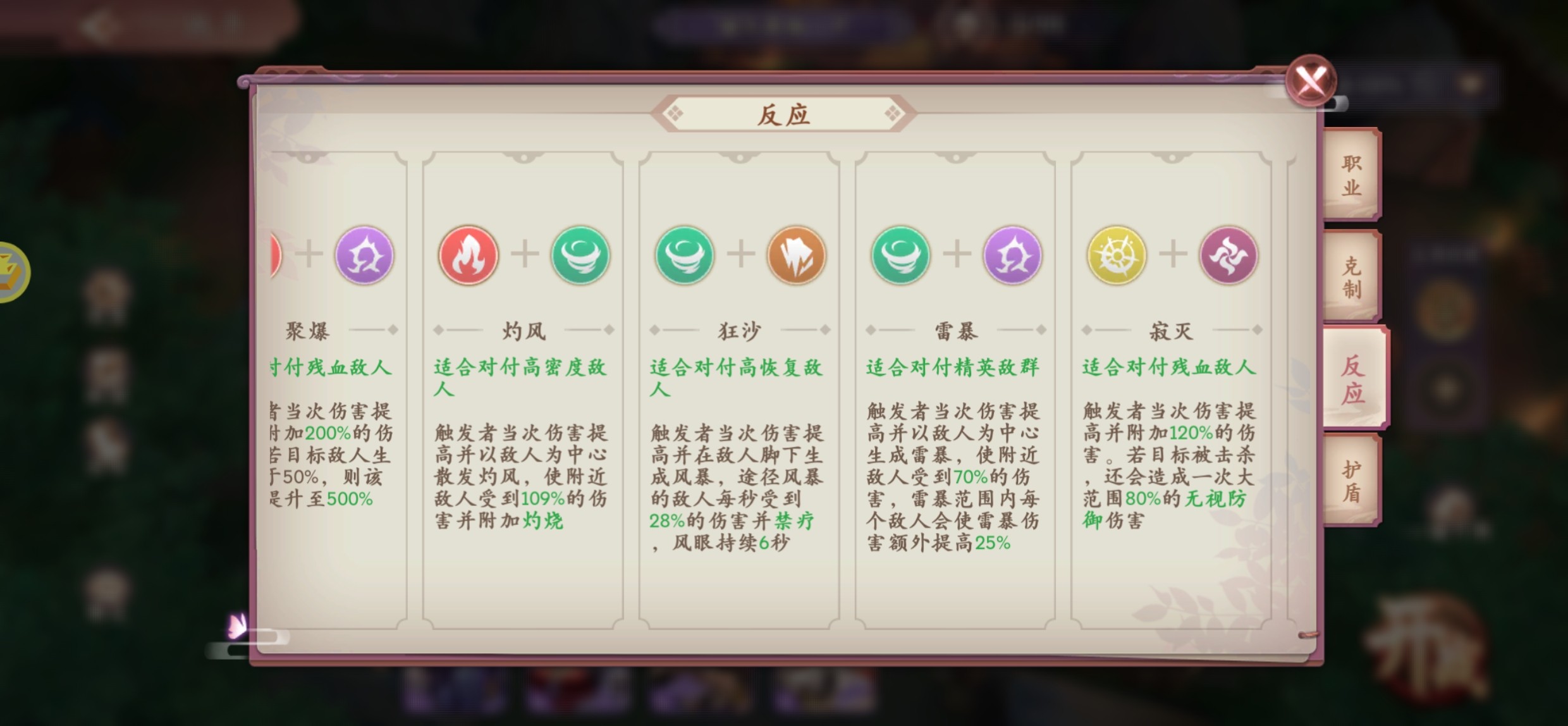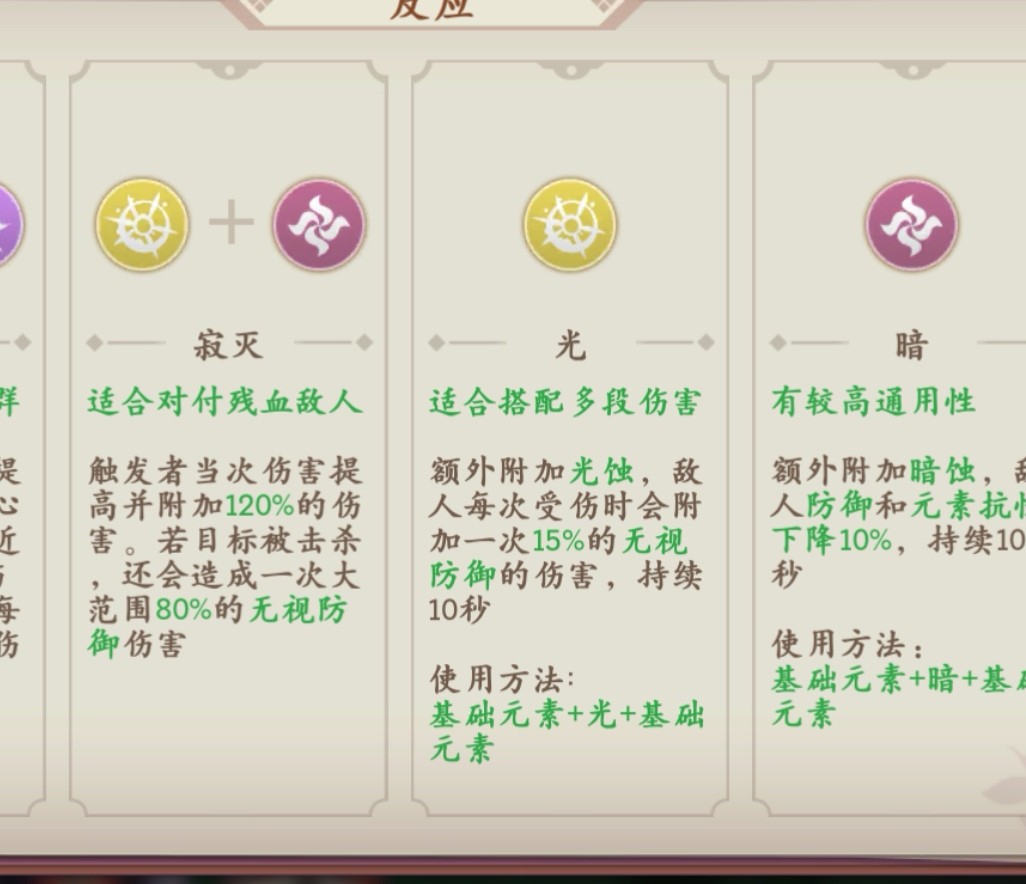 以上就是给大家带来目前比较常用的元素效果反应组合。其中雷暴 灼风 聚暴 寂灭 寒风 岩浆,在当前版本非常好用,特别是前期可以说是百搭元素效果组合,一定要多熟练。熟悉这几个元素效果组合的运用,很多副本和活动基本上没有压力。在这里说一下,元素效果一定要在合适的时机使用,才可以有非常好的效果。