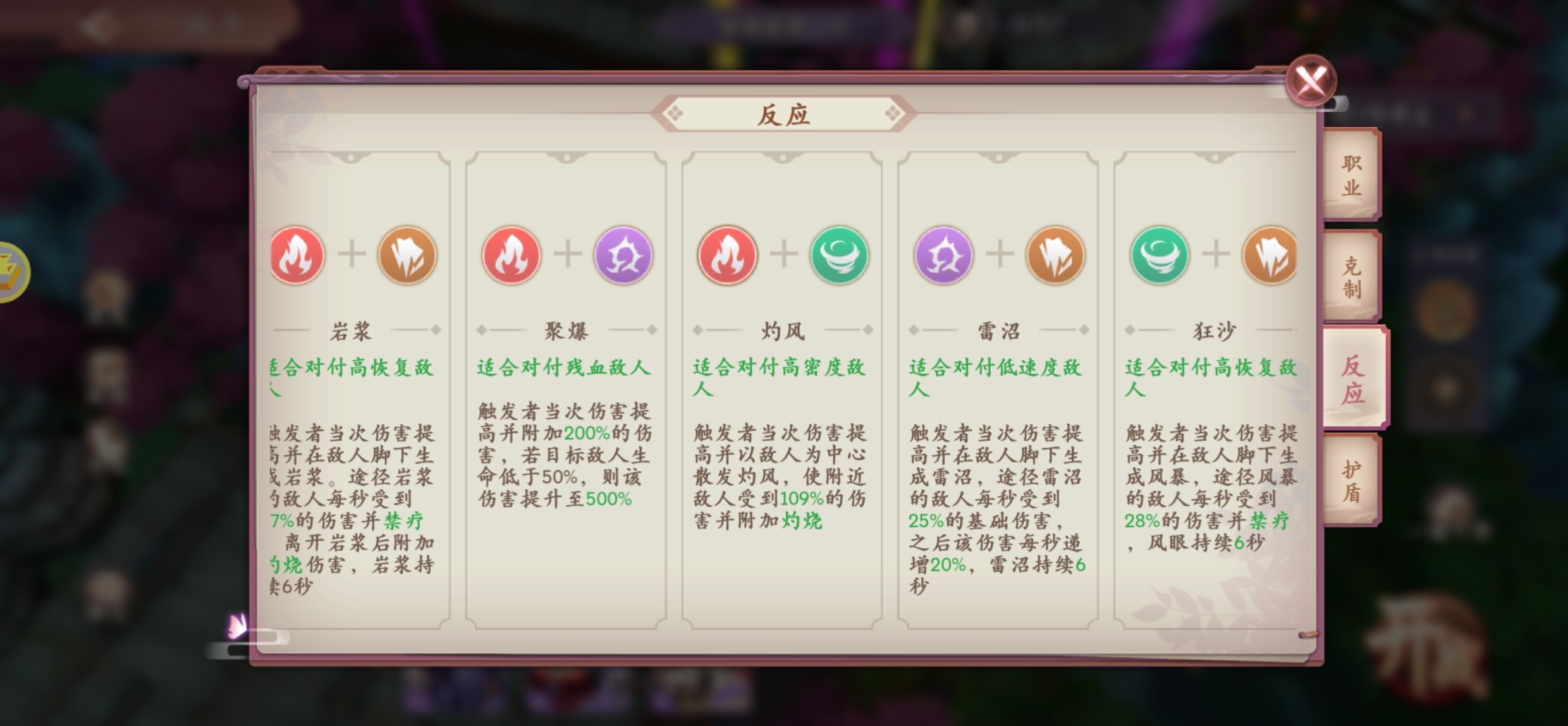 这套阵容:主c神将没有变化,依然是后羿加女帝。流萤加恶狼可以触发狂沙,对恢复的敌人可以起到6秒的一个禁疗效果,同时这套阵容有个很关键的元素效果反应组合,后羿加恶狼。火与土的元素效果组合,可以触发岩浆效果。千万不要小看了这个岩浆效果,岩浆效果持续时间长。对一些停留的精英怪和大范围的小怪都有着持续的高额伤害,并且岩浆还携带3秒的禁疗效果,配合狂沙形成双禁疗组合。清理怪的时候有时候比雷暴还好用。