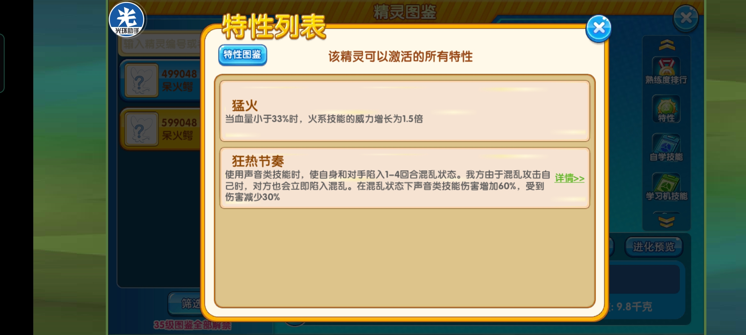 特性方面有2个,一个为之前就有的猛火,还有一个新出的比较有意思的特性狂热节奏,效果是使用声音类技能时,使自身和对手陷入1-4回合混乱状态。我方由于混乱攻击自己时,对方也会立即陷入混乱。在混乱状态下声音类技能伤害增加60%,受到伤害减少30%。