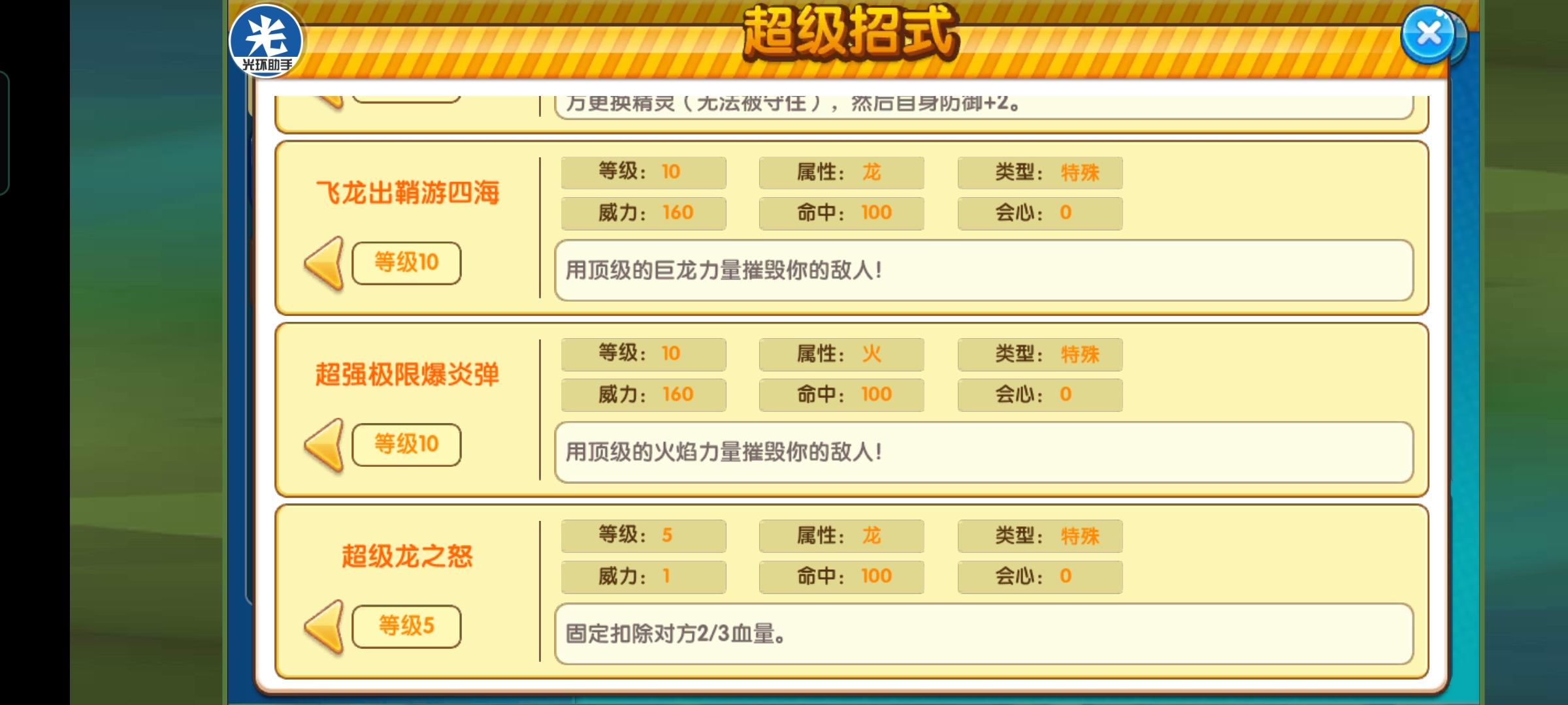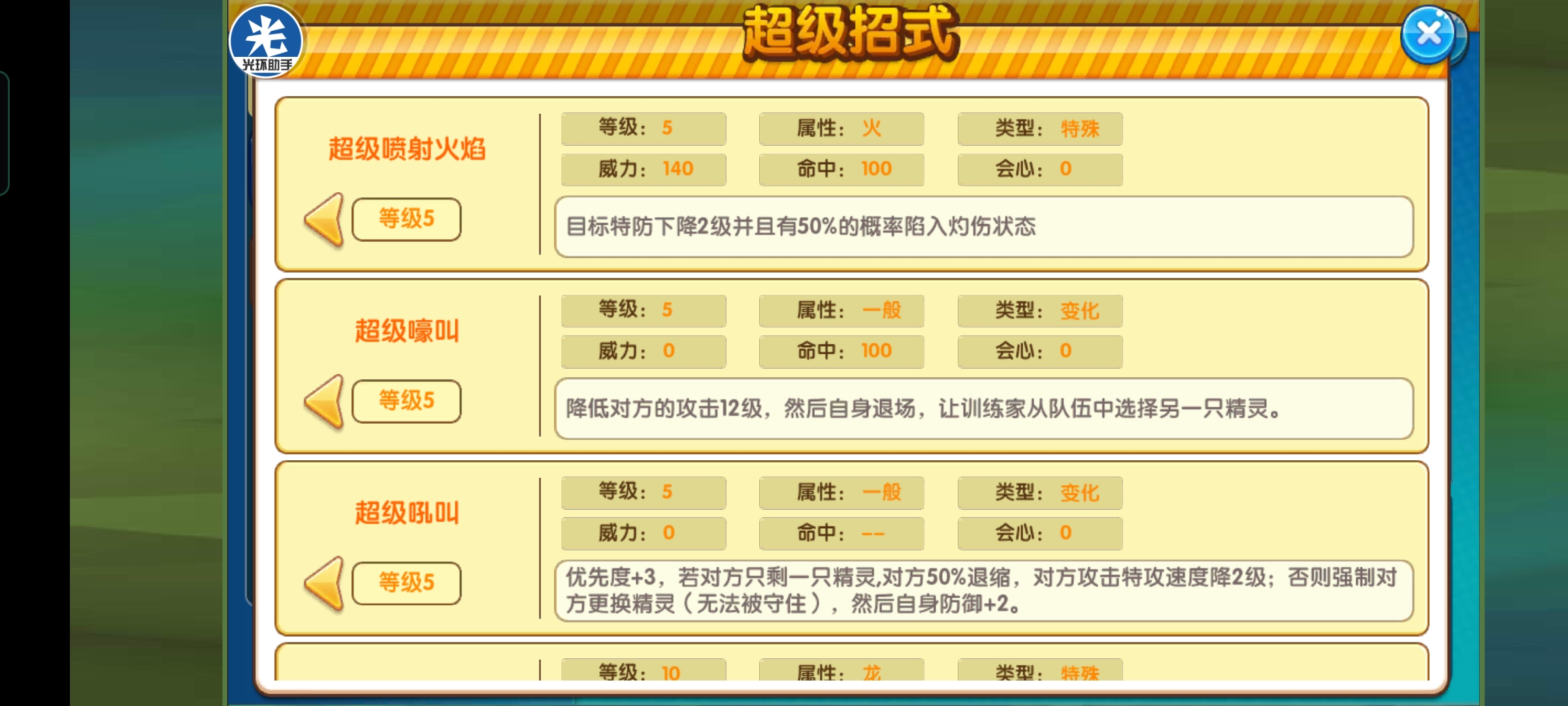 大招推荐超级吼叫,遇到天敌克制,可以容错一回合,比如你刚刚强化完,准备输出,然后对方上闪光Z神,这时候不切只能送掉,切了又浪费强化的损失血量,就可以超级吼叫逼退再输出。