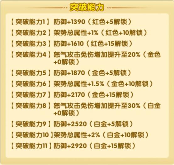 因为突破至金色与白金以后均有高级属性提升,所以问题来了,是先凑齐一套均衡突破呢,还是集中一个突破?因为一套均衡突破可以激活连锁属性,以及提前享受多属性,所以我的建议是先凑齐一套红色,然后将一个集中突破至金色,然后再一套金色,最后再逐个突破至白金一套;至于白金以后就不建议继续提升了;