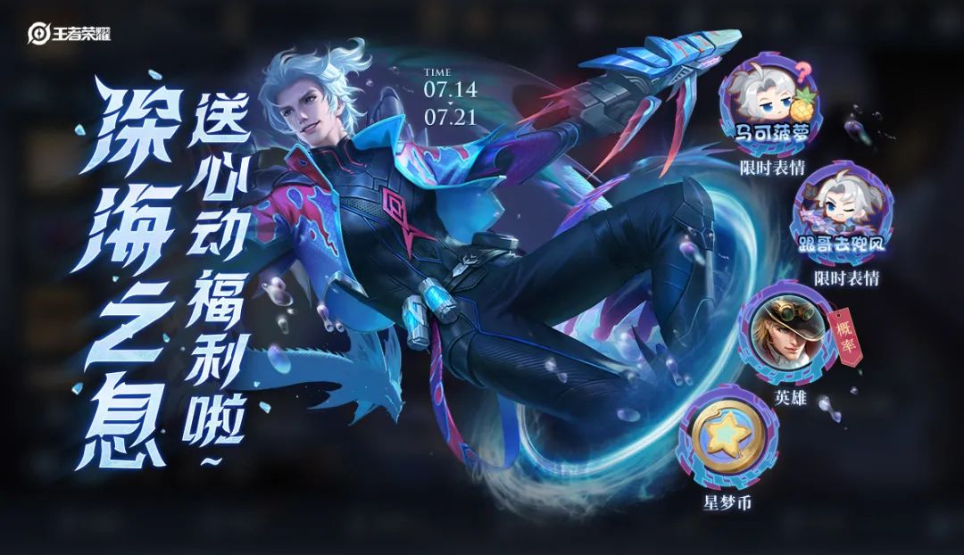 深海之息的礼物活动开启啦!参与有机会获得射手英雄自选礼、限时表情、星梦币(收集用于兑换英雄、播报、限时语音)等奖励。