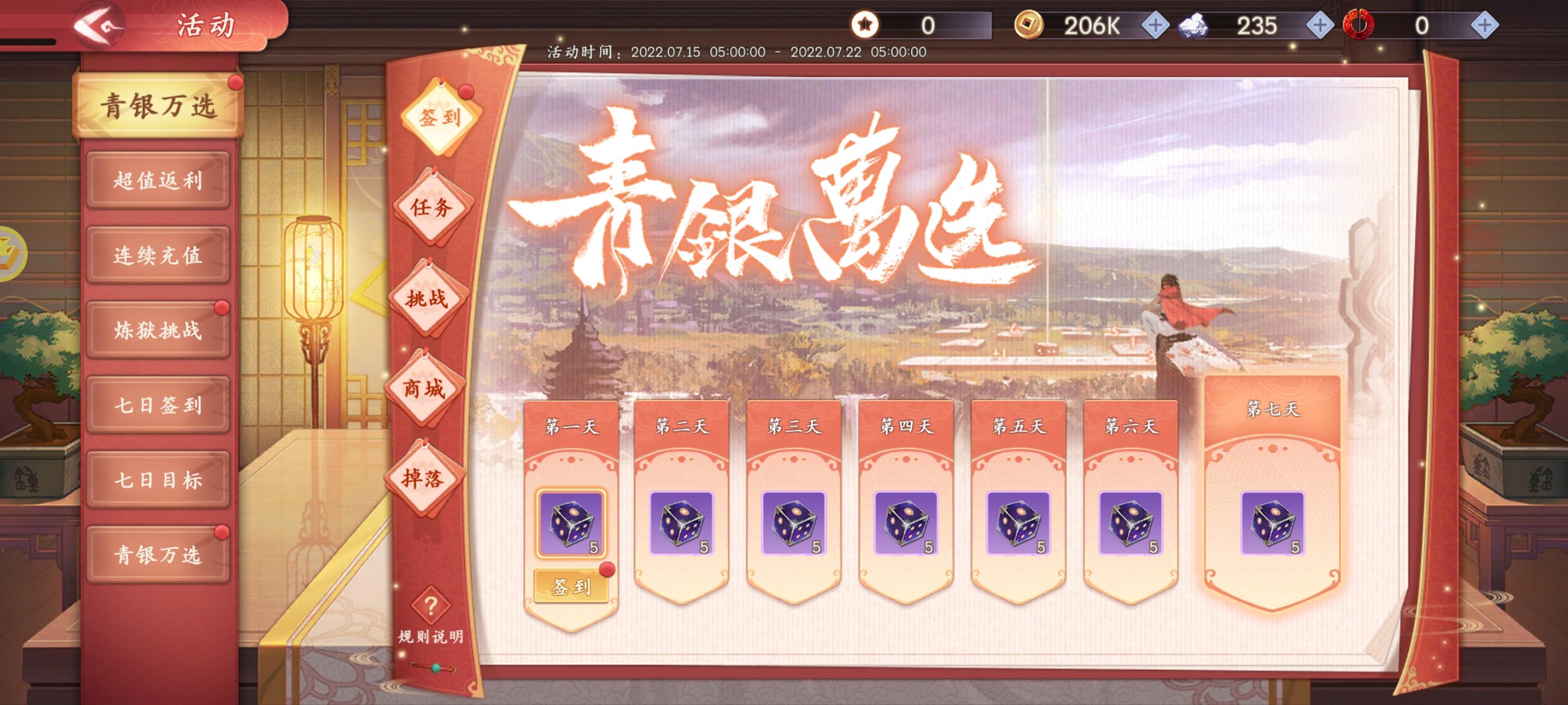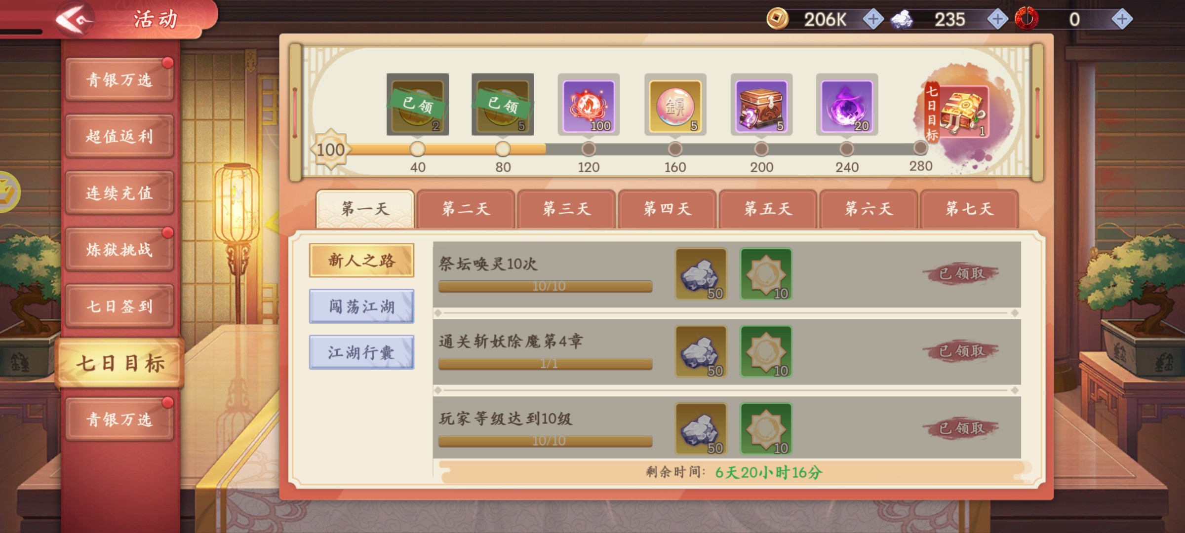 首先 七天乐活动分为签到和七日目标,七日目标包括新人之路(每日活跃度)、闯荡奖励(支线 没有硬性要求要完成)以及江湖行囊(商店)