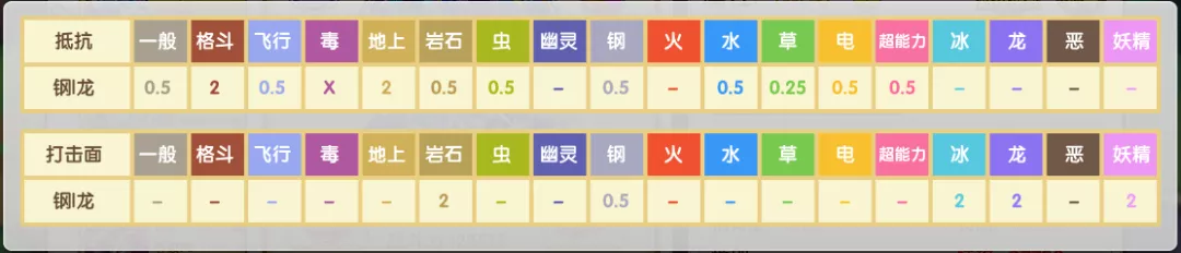 打击面:钢与龙的打击面虽然看上去能够造成克制效果的属性并不多,只有岩石、冰、龙、妖精四个。但实际相当优秀,摆在当前环境也是大有作为,只有钢系一个单独的属性是无法造成有效伤害的,其余均为一倍克制关系,不需要去考虑因打击面的缺陷而必须下场的问题。配合闪光帝牙卢卡钻石霸主形态的霸道输出能力,只需要半刻钟时间即可将对手歼灭殆尽。