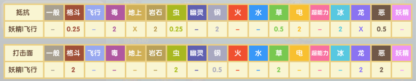 打击面:妖精+飞行的打击面比较全面,除了钢系作为天敌,仅能造成0.5倍伤害,其他基本维持1倍伤害以上的水准,而在格斗、虫、草、龙、恶系属性,克制到达2倍,能有效打击如椰蛋树、乐天河童、露莎米莱尔、基格尔德等精灵。