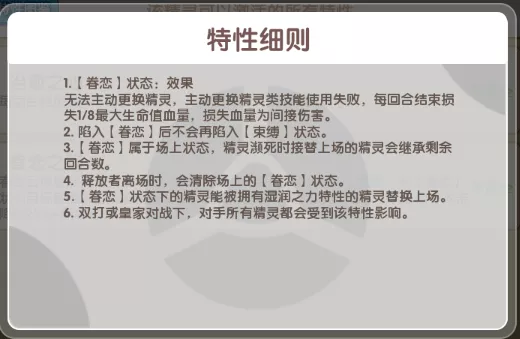 ①眷恋云接替濒死精灵上场,对手进入5回合的【眷恋】状态,无法主动更换精灵,主动更换精灵类技能使用失败,每回合损失1/8最大生命值血量。