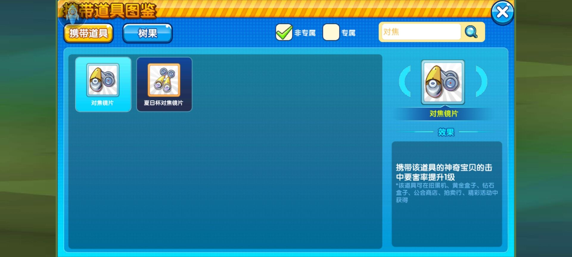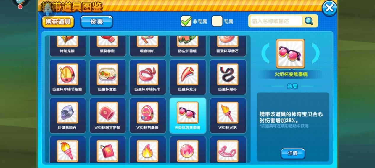 作为一个打暴击的精灵,那暴击专用道具肯定是必不可少的。首先来一个少有的暴击神器火炬杯变焦眼镜。这可是目前为止暴击道具的天花板,虽然不是人人有,但论伤害程度和破坏力还是有必要介绍这个神器。他的能力是携带道具的精灵会心伤害增加38%。这可是多么恐怖的破坏力,相信很多也被这个携带这个道具的柱子王和水龙所推过,可见实力非同一般。