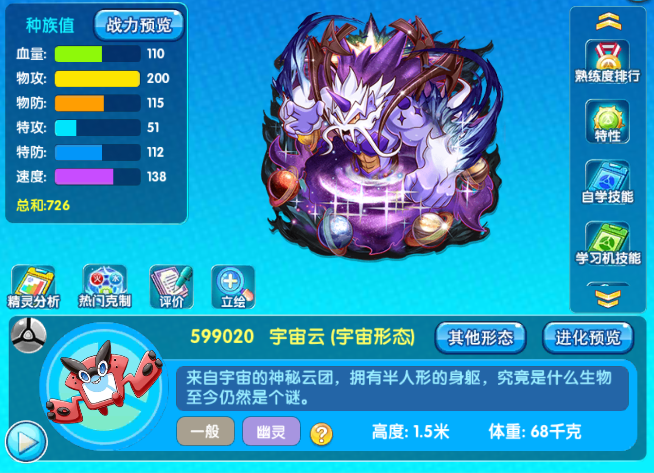 这一次给大家讲一下宇宙云的玩法大家从标题上面也能够看得出来的宇宙云的环境属实是有些差,究其原因就是因为本身的速度和防御能力已经完全不符合当前的版本情况了,但是整体来说,这个精灵如果撇开防御和速度不谈,那么在整个游戏当中,宇宙云的伤害能够排在历史当中的前30名,也就是说宇宙云当前版本并不是最佳输出选择并且处在边缘,但是从整体能力和书方面来说,一般没有主流输出的玩家是可以使用宇宙云的。