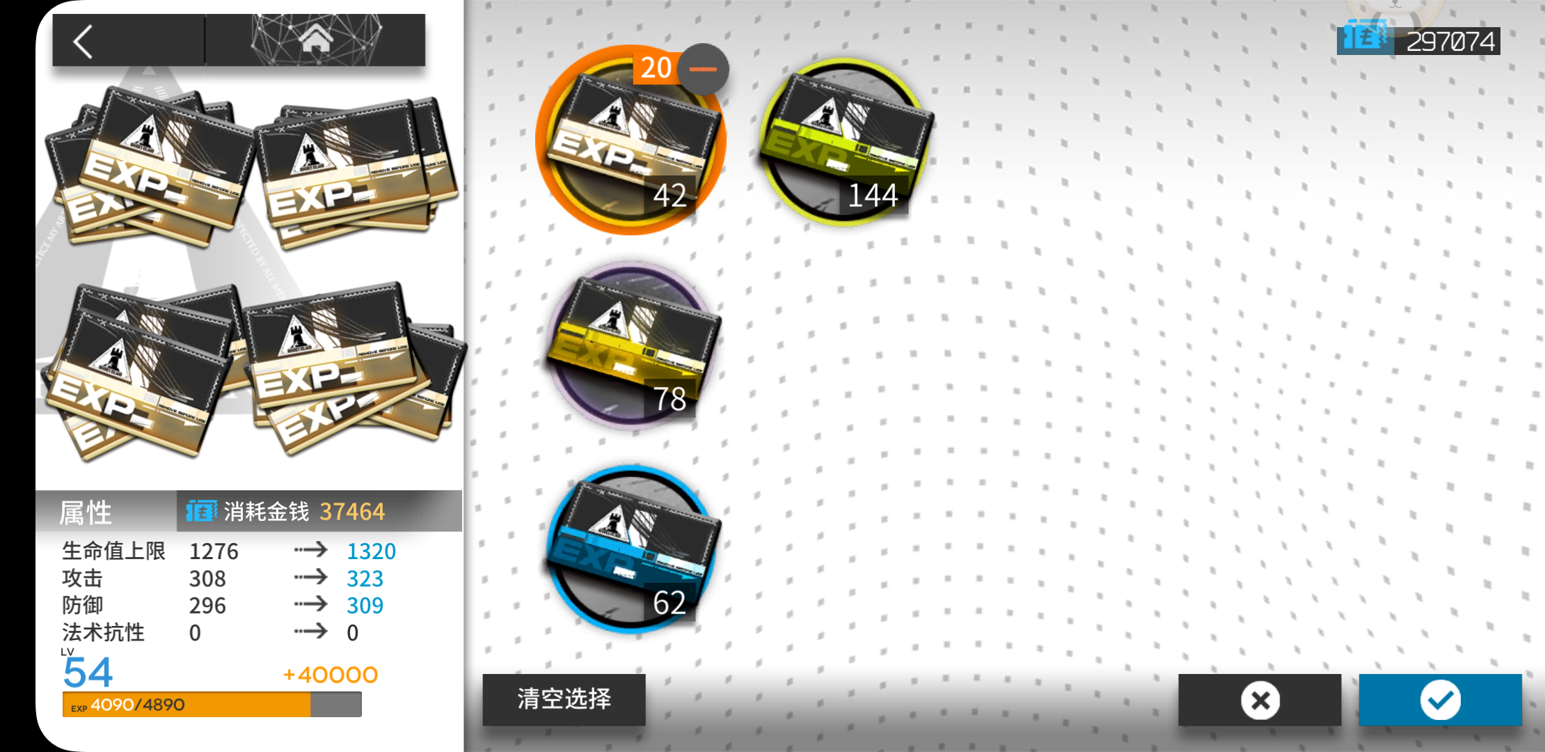 ③经验升级(升级经验条,属性增加值,经验卡仓库)金卡2000ex 黄卡1000ex 蓝卡400ex 绿卡200ex,一次最多投喂40张经验卡,并且投喂需要消耗龙门币。