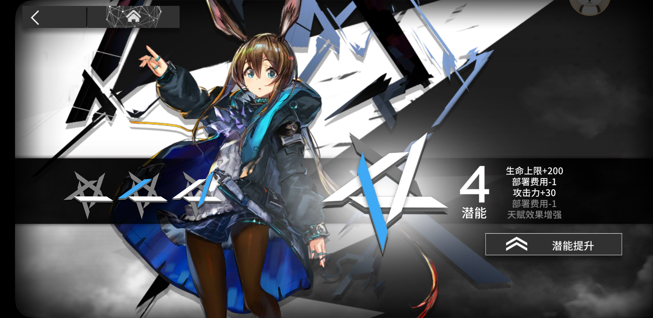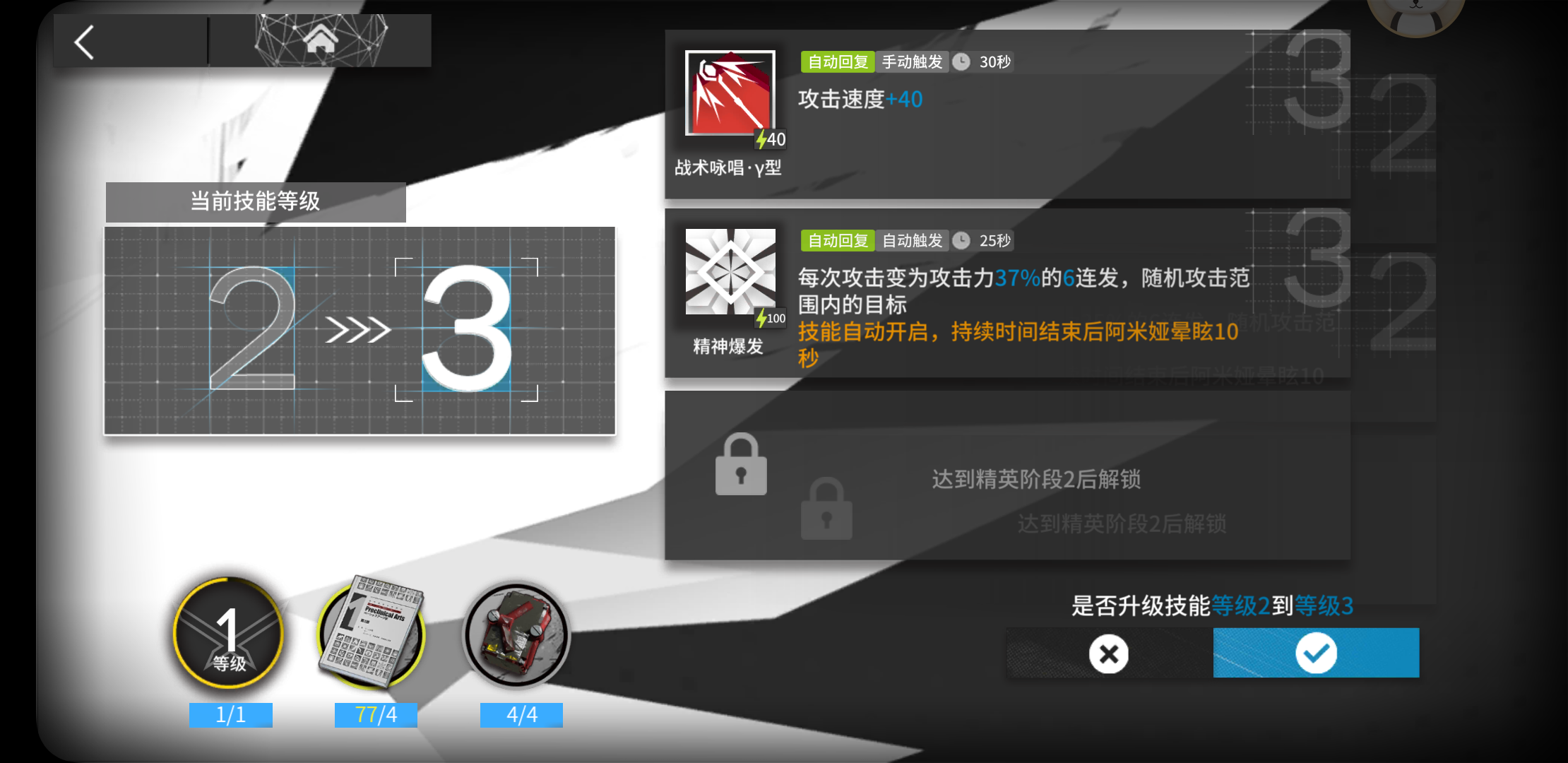 ⑥技能(已习得技能,当前技能等级,升级所需材料,左右滑动进行升级数值对比)注:默认技能是指下次编队时干员自带技能而非当前所有编队的干员技能都替换成默认。绿色小闪电是充能所需技力sp,小钟是技能cd,播放键是持续时间,没有播放键则是被动或者自动触发型技能~