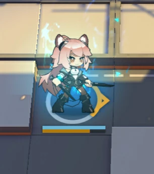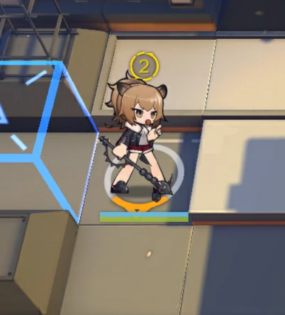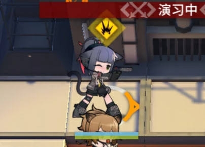 15场上干员状态(蓝条生命值,绿条技能充能状态,黄圈技能充能次数,脚下圆圈为攻击面向,头上黄标为手动大招充能完毕提示,脚下代替技能状态条的棕条为已开启技能持续时间)。