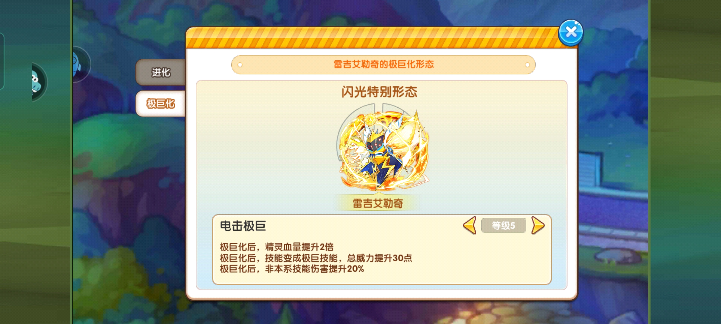 以电神柱为例首先,什么是极巨化?极巨化就是,能够开启极巨化的宠物,在每场战斗中可以点击极巨化按钮进行极巨化,在极巨化后,宠物种族值将会提升100,血量变为原来的2倍。没有极巨化后特效的技能,将会变成本系对应的极巨化技能,威力上升30,技能威力上限150。非本系技能威力将会提升20%,而所有的变化技能,不论属性,都将变为极巨守住。部分技能在极巨化后,将会具有特殊效果。而有特殊技能的效果,可通过右下角的极巨化图鉴进行查询。