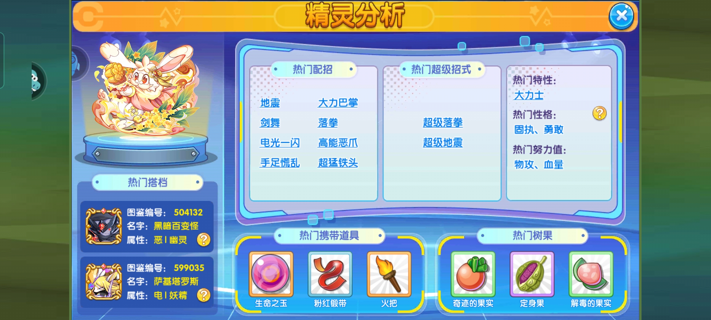 作为中秋的闪光宠物,掘地兔普地的属性在联防胡帕的过程中能够产生不小的优势,并且特性大力士,可以让物攻翻倍,除此之外,极巨大力巴掌作为其核心输出技能,不仅威力能够突破150威力上限的限制(最高能够达到190)。 再配合骗术空间下的先手优势以及大力士特性的输出加成,掘地兔在面对非钢系岩石系的联防时能够打出非常出色的效果。