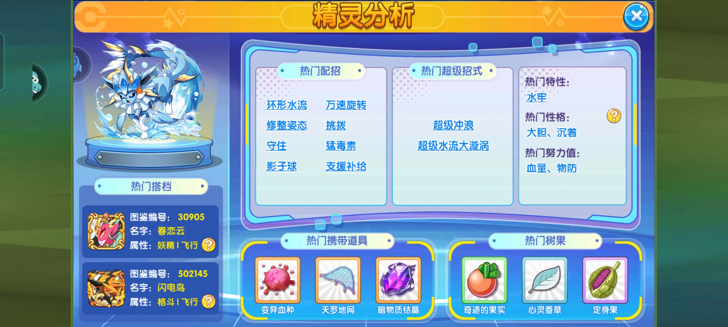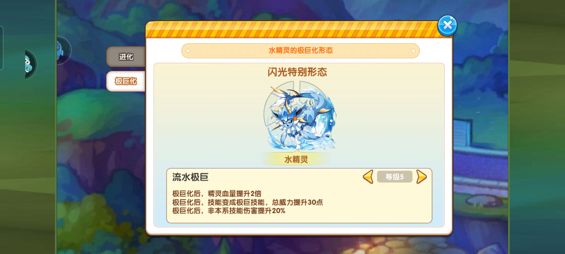 极巨化水精灵放在这里,因为作为一个防御性的功能宠,防御比他出色的大有人在。不过相较于那些不能极巨化的宠物来说,能够极巨化可以说是给了水精灵第二次生命。 水牢特性下,每回合都可以削减对手的血量,而对面如果使用回复技能则效果更甚。
