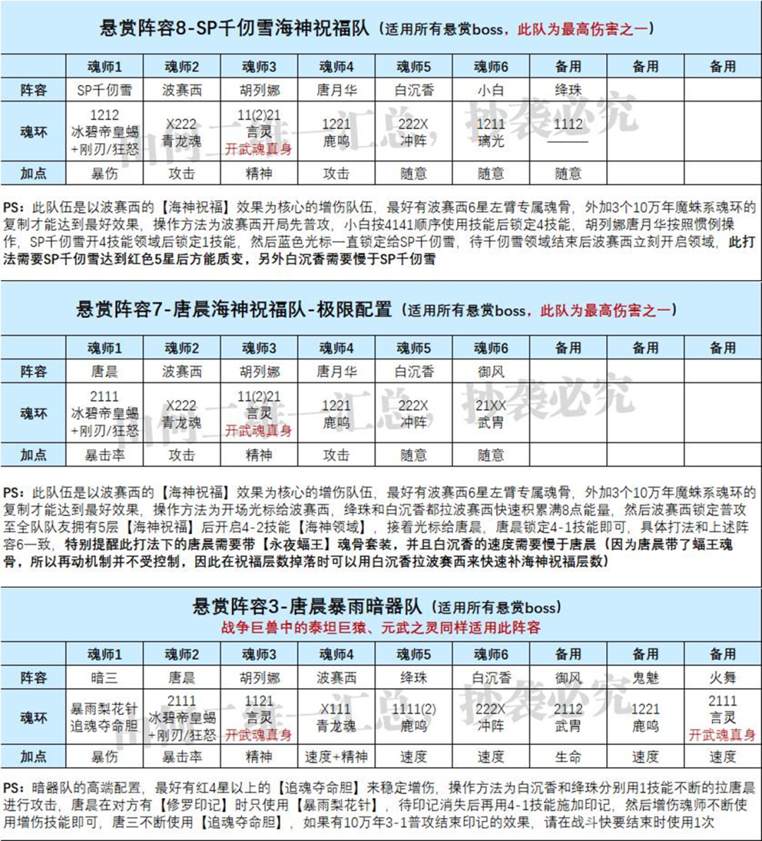 第二天boss血刃裂魂牛:最优选择SP唐晨海神祝福队+冰魄之意buff,因为敏攻系魂师的蝶后头骨具备吸血能力,同时蝶后右腿骨也具备护盾能力,因此这两项能力的联合就能很好的规避boss的技能50%反伤效果,而SP千仞雪则会在这个反伤效果上吃很大的亏