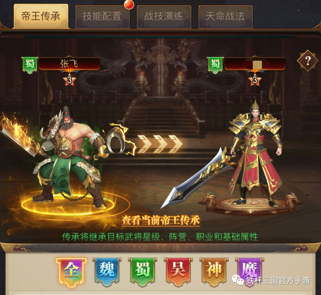 帝王可以通过继承主公目前所培养的随意武将的星级,等级上限,阵营,职业和基础属性,能够省去培养武将的资源以及时间,被继承的武将也不会有任何损耗。