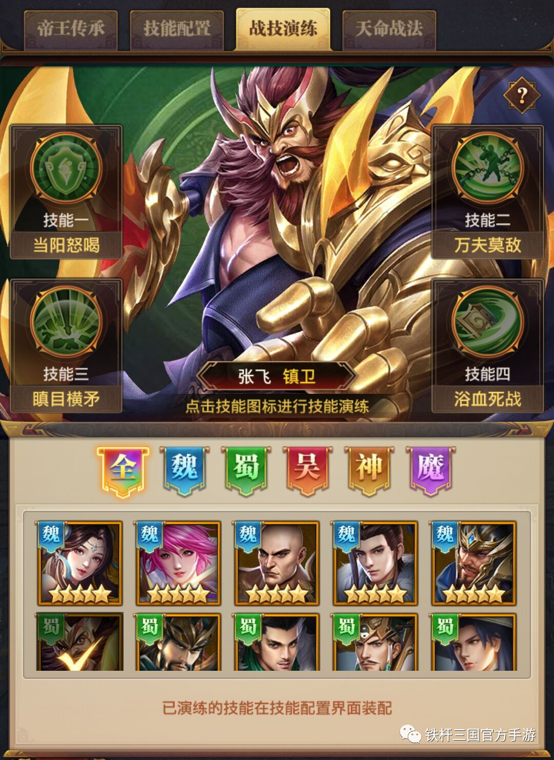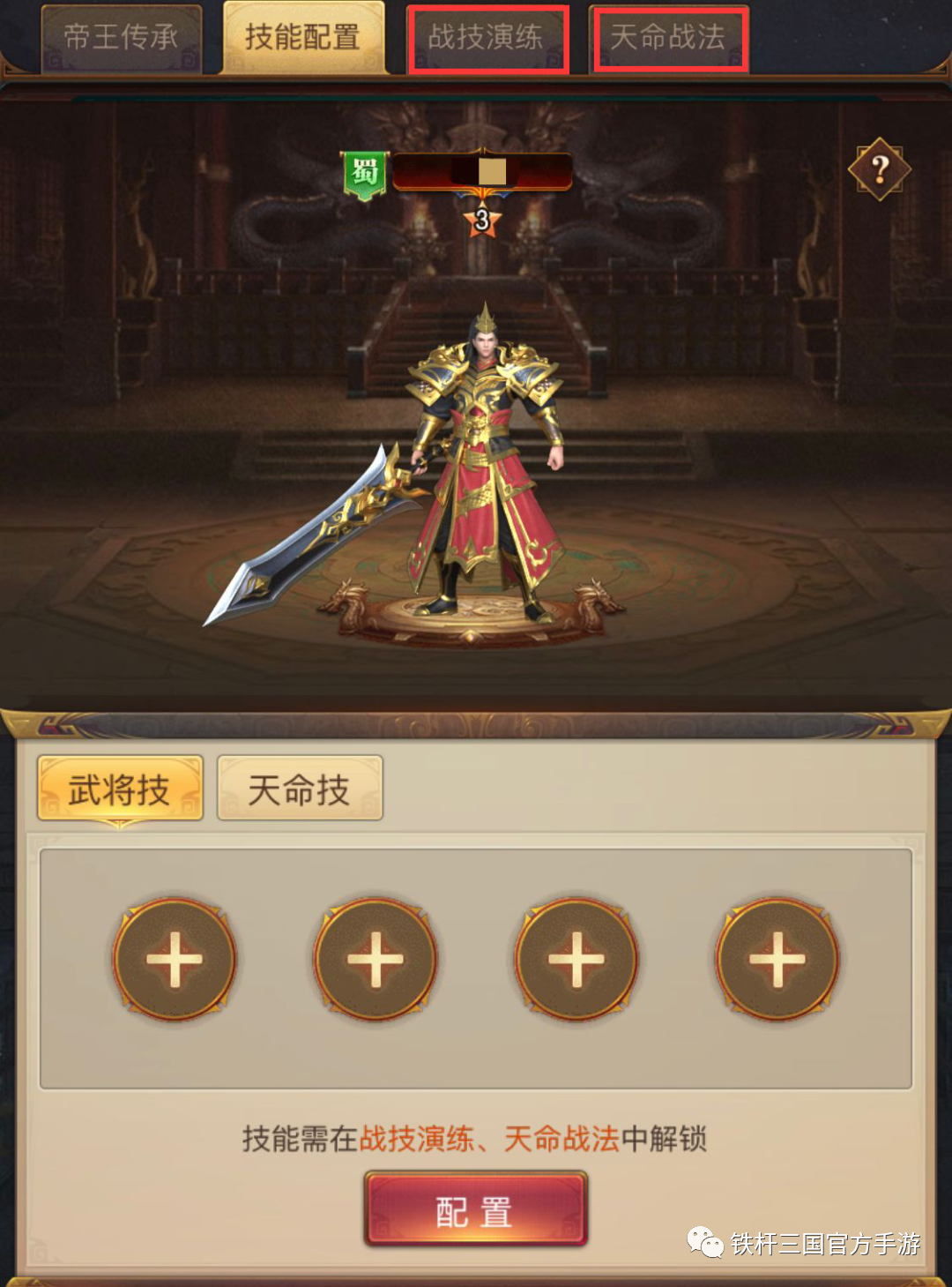 帝王武将原始状态是没有技能与天命技能的,这需要主公们在战技演练与天命战法之中解锁技能。