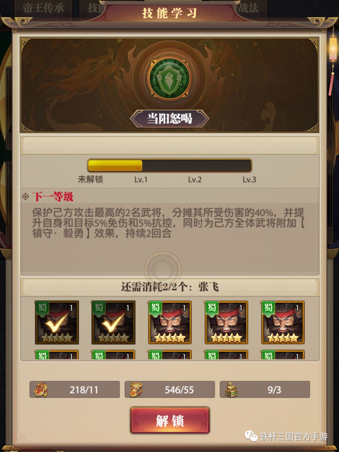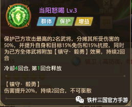 一技能:蜀张飞一技能【当阳怒喝】,分摊己方攻击最高两名武将收到的伤害,并附加【镇守·毅勇】效果。