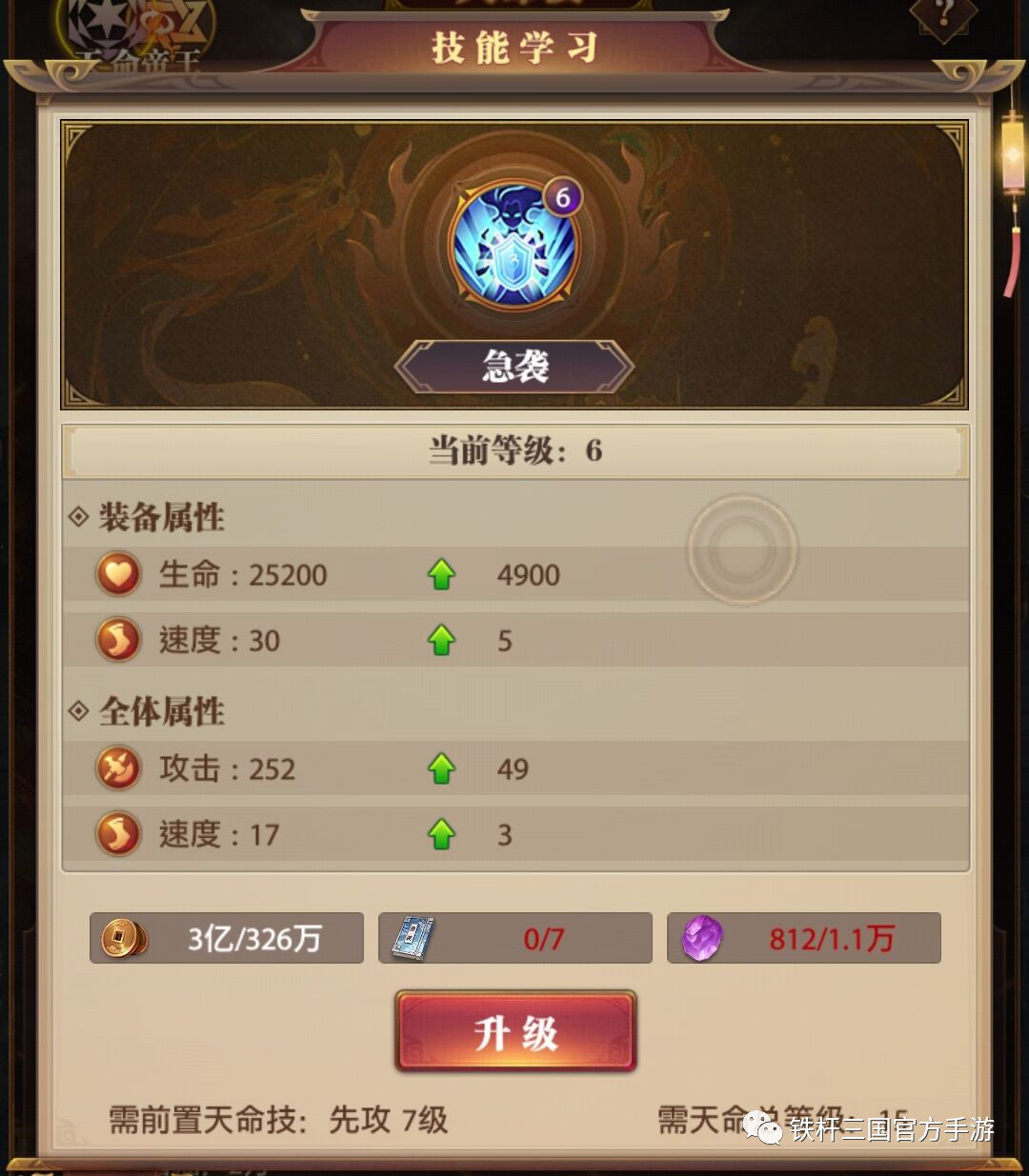天命技能也是同理,通过消耗所需道具进行解锁升级。
