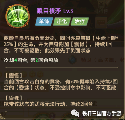 三技能:蜀张飞三技能【瞋目横矛】,驱散自身负面状态,恢复生命,并为自身附加【震慑】效果。