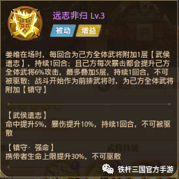 四技能:神姜维四技能【远志非归】被动技能,每回合附加1层【武侯遗志】效果,且己方每次暴击都会提升己方全体武将6%的攻击,为己方附加【镇守·强命】效果。