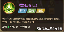 一技能:蜀诸葛亮一技能【坎卦回春】,为己方全体武将回复生命值,并提升30%的攻击。