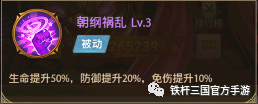 二技能:魔董卓的二技能【朝纲祸乱】被动技能,提升生命,防御与免伤。