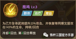三技能:神蔡文姬三技能【凰鸣】,提升己方全体武将25%的攻击,并回复生命值。