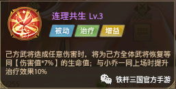 四技能:吴大乔四技能【连理共生】被动技能,己方武将造成任意伤害时,将为己方武将回复【伤害值7%】的生命值。