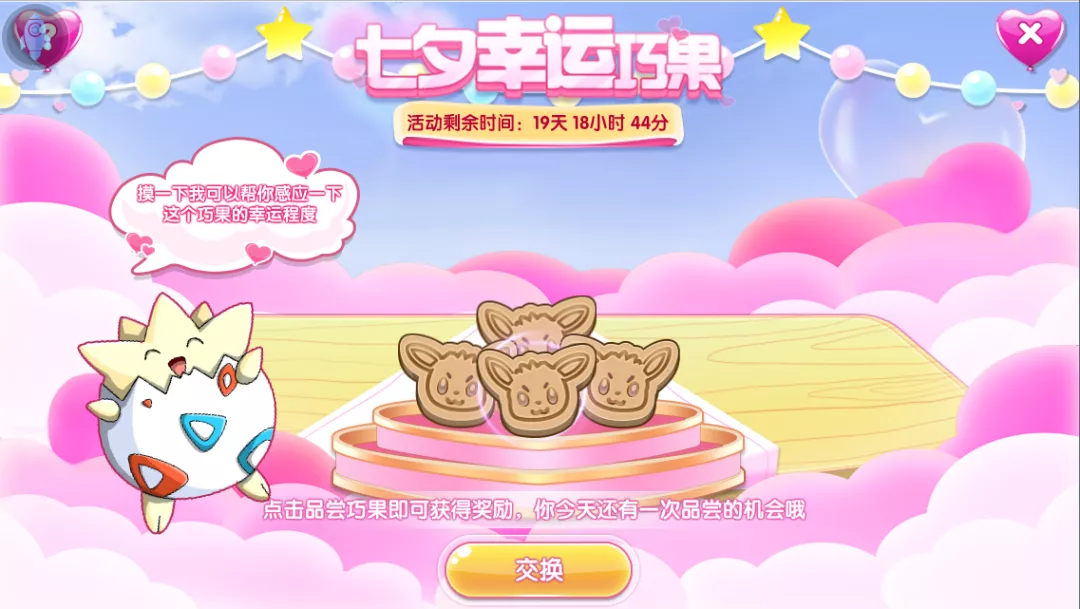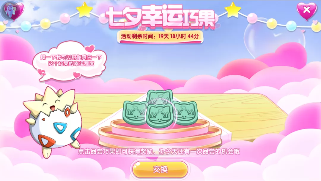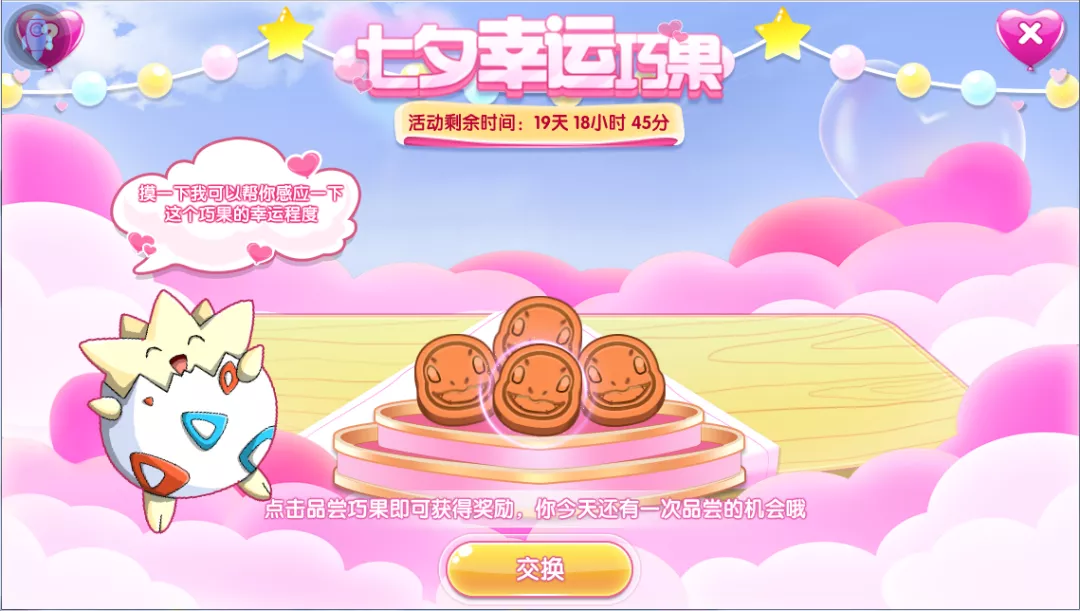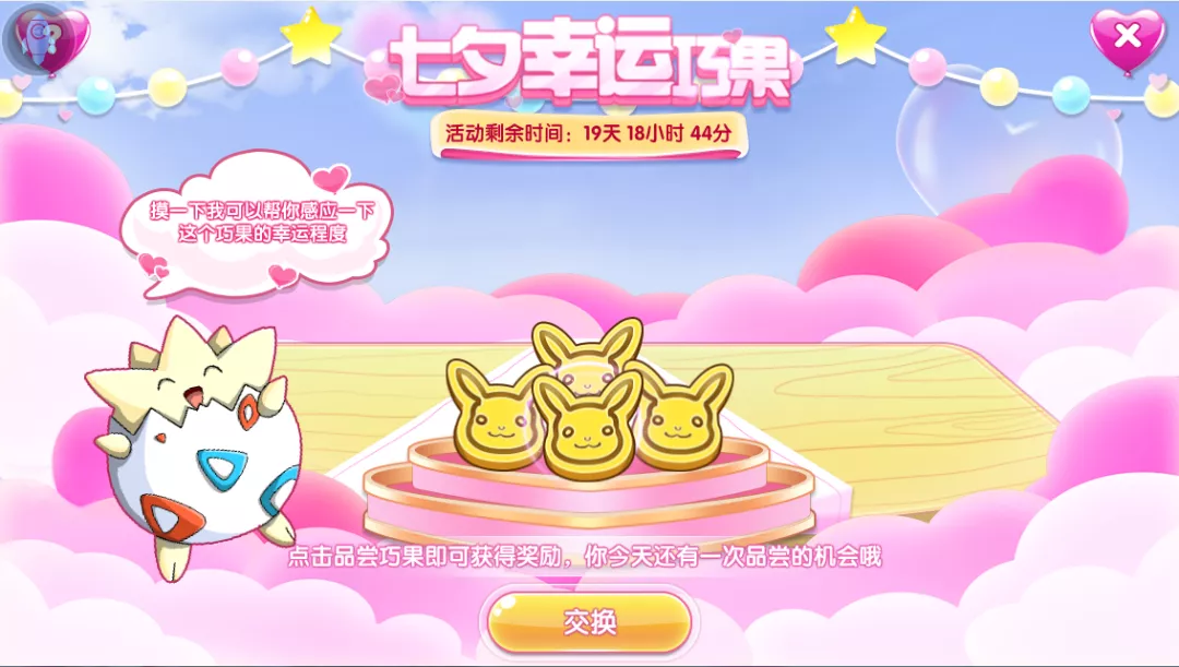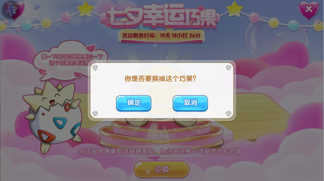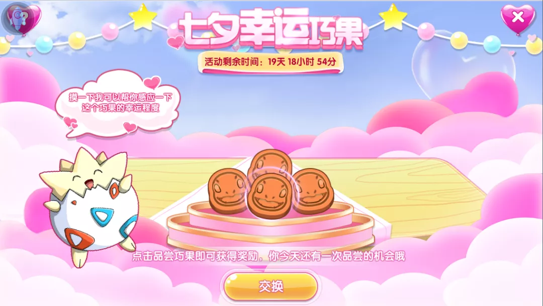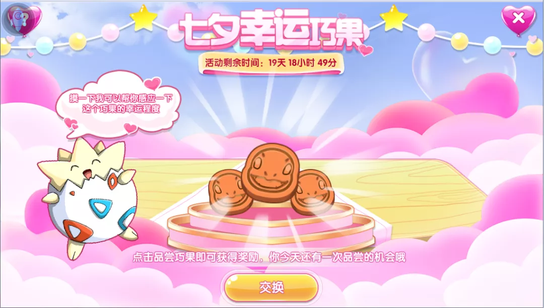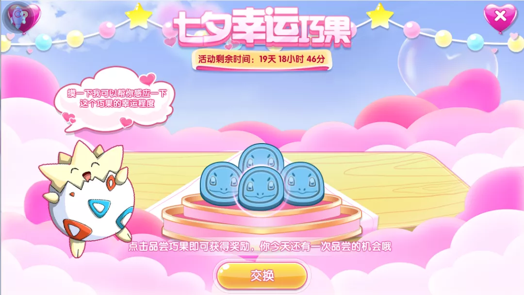 当然幸运星波克比还在象征性的在每种巧果中都添加了两种不同程度的奖励。那怎么分辨呢?波克比很喜欢跟可爱的玩家们接触,你只要摸一摸它,它就会帮你感应一下巧果背后藏着的礼包中的奖励丰富程度(其实就是它自己偷看一下它自己藏起来的礼包里面是大奖还是小奖),发出银色光芒代表是小奖,发出金色光芒代表是大奖。它准备两种奖励并不是因为吝啬,只是希望你们能多摸几下它,所以如果你看到的是银色光芒,不要灰心,点击一下下方的交换按钮就可以换一盘巧果,重新摸一下波克比就可以重新感应,交换跟感应是没有次数限制的,波克比怎么可能拒绝别人摸它呢?亲爱的玩家们,无论是为了奖励还是让波克比开心,都尽量多模几下波克比确定好奖励,再来吃掉巧果获得波克比藏好的奖励吧。