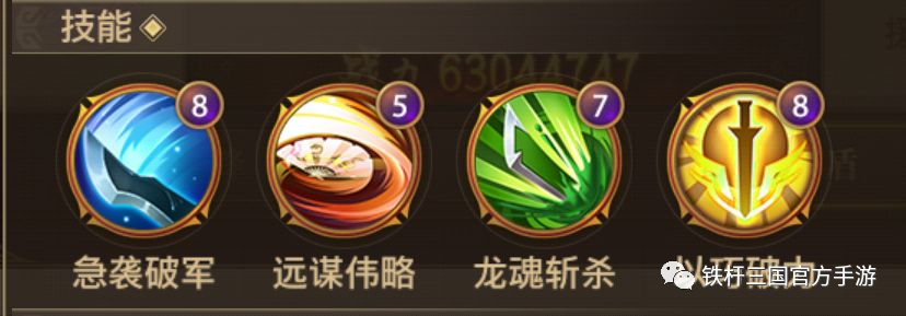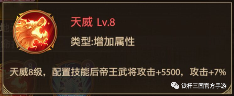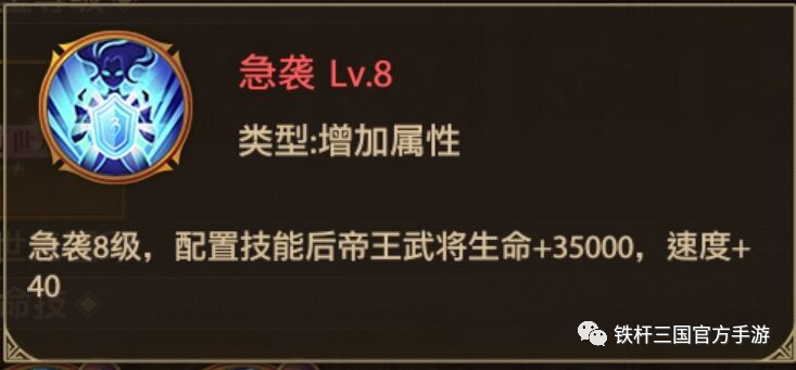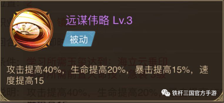 二技能:帝王武将专属帝王技【远谋伟略】,提升攻击,生命,暴击与速度。