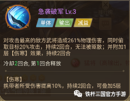 一技能:魏张辽一技能【急袭破甲】,对敌方攻击最高的武将造成物理伤害,同时偷取20%的攻击,并对目标附加【寒伤】效果。