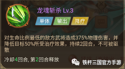 三技能:蜀关羽三技能【龙魂斩杀】,对敌方生命比例最低的武将造成物理伤害,并且降低目标所受治疗效果。