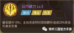 四技能:神夏侯涓四技能【以巧破力】被动技能,提升暴击,主动攻击时对目标额外造成百分比攻击的真实伤害。