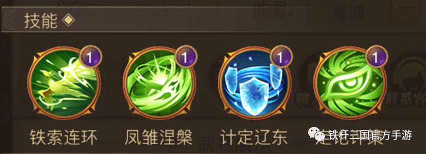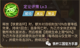四技能:蜀庞统四技能【定论评策】被动技能,释放一技能【铁索连环】时,额外对目标附加伤害降低效果,自身阵亡时将驱散己方全体武将所有负面状态,为存活武将提供治疗效果,并提升攻击。