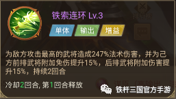 一技能:蜀庞统一技能【铁索连环】,对敌方攻击最高武将造成伤害,并为己方前排武将提升免伤,为后排武将提升伤害。