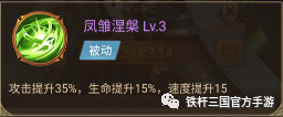 二技能:蜀庞统二技能【凤雏涅槃】被动技能,提升攻击,生命与速度。
