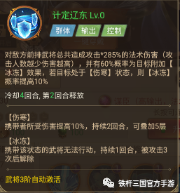 三技能:魏郭嘉三技能【计定辽东】,对地方前排造成伤害,并有概率为目标附加【冰冻】效果。