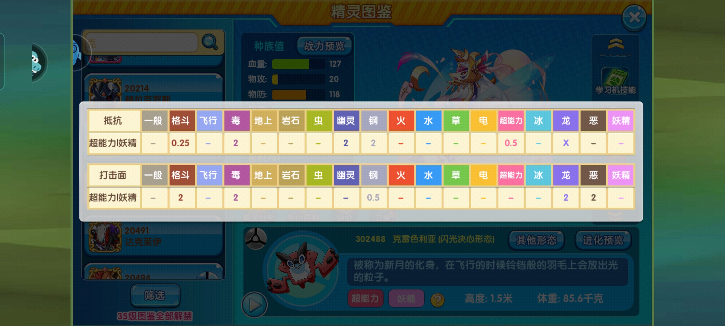克雷色利亚的血量高达127,这在目前的版本里已经是相当不错的了,127的生命值配合双防让她的坦度很高,很难被秒杀,两个防御都不错,特别是特殊防御,不过182的特攻和128的速度虽然一般,但是有特性加成。