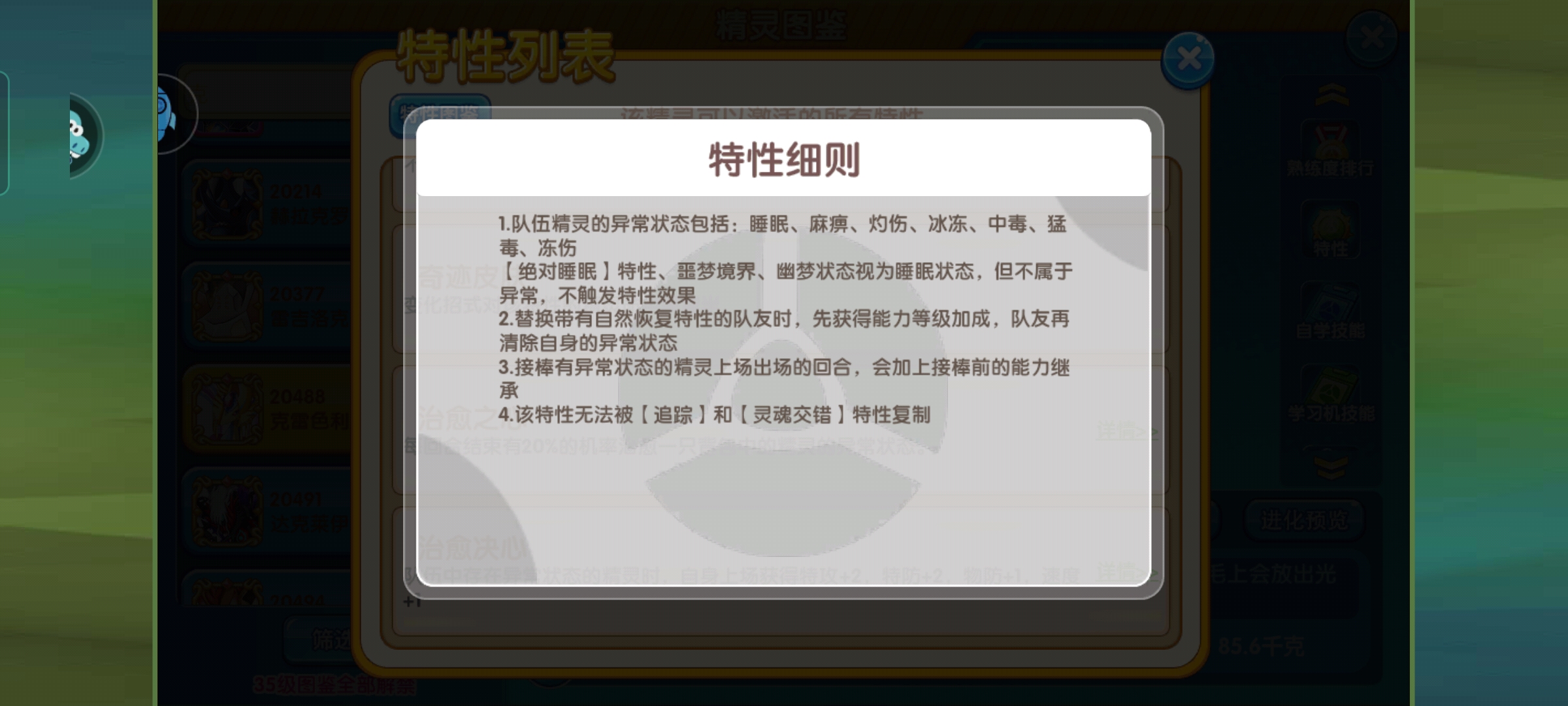 当然,这也是有代价的,需要队伍里有异常状态的精灵,所以我们给克雷色利亚选择队友时需要仔细斟酌。再看到特性细则,已经具体说明了符合特性触发的异常状态。