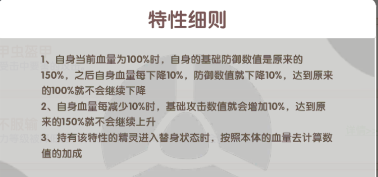 这个特性,看完之后我表示,不知道怎么解释了,当自身的血量变低的时候,攻击力就会提升,当自身的血量变高的时候,会不会提升防御力呢?这个我个人是不知道的,因为特性上面没有说明,但是让我比较惊讶的就是替身消耗的血量,竟然也算,这也就是说,他只要利用替身增加自身的攻击力,然后再进行输出就可以了,不知道这只宠物在实战当中怎么样呢?目前来说真的不好讲只能等待实战的视频了,我昨天下午就兑换了这只宠物,目前性格很不好,没有玩。以后有机会我会打一局实战视频,然后给大家看的技能搭配