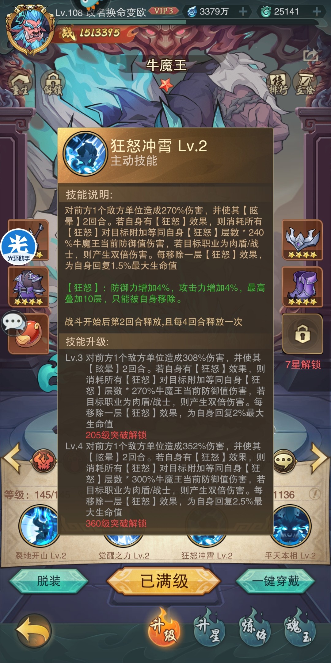牛魔的混伤机制是自身攻击力%+自身防御%+被动层数的三重混合伤害,所以这就使牛魔的伤害非常高,如果打坦克或者战士伤害还会翻倍,就拿145级的牛魔来说,7w攻击+4w防御+五层被动不暴击都可以一刀砍135w伤害,是不是很不可思议?没错的这就是混伤的威力