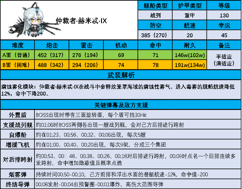 毁灭:会持续对全队造成伤害百分比,但不会影响后排隐蔽,考虑到此BOSS对后排输出本身较低,对后排生存威胁并不是很大;前排生存会受到较大影响,配队时应注意利用航母消弹和生存拐提高前排生存,以保证后排的输出时间。
