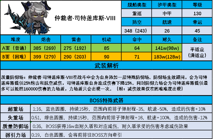 护盾超载模块:BOSS低血时会生成阻挡平射子弹的盾,但不阻挡跨射,因此对战列和超巡的输出基本没有影响;前排的选择,超巡优先于重巡,护盾:大量耐久:每隔20秒生成一个20%最大耐久的盾(约27w),盾很厚,可以完全吃掉后排一波输出,因此得考虑绕盾。值得注意的是,盾的计数时间似乎是从BOSS进场后开始算的,因此第一个盾持续时间为23-28秒,后续每20秒一次,目前高装填的战列在装备火控的情况下,完全可以再每次开盾前打完一轮输出。航队有两种思路,对于科技装填拉满、顶级航母200好感的情况,可以考虑通过快飞机(如彗星一二甲、彩云、Ju87)+信标+跨队技能(如独立)的配合,在开盾前打完输出;对于装填较低的玩家,可以考虑用慢飞机(天雷、3c、流星、未满强轰炸机)配合适当降低科技装填,将飞机起飞时间控制在23秒以上,在盾结束后进行